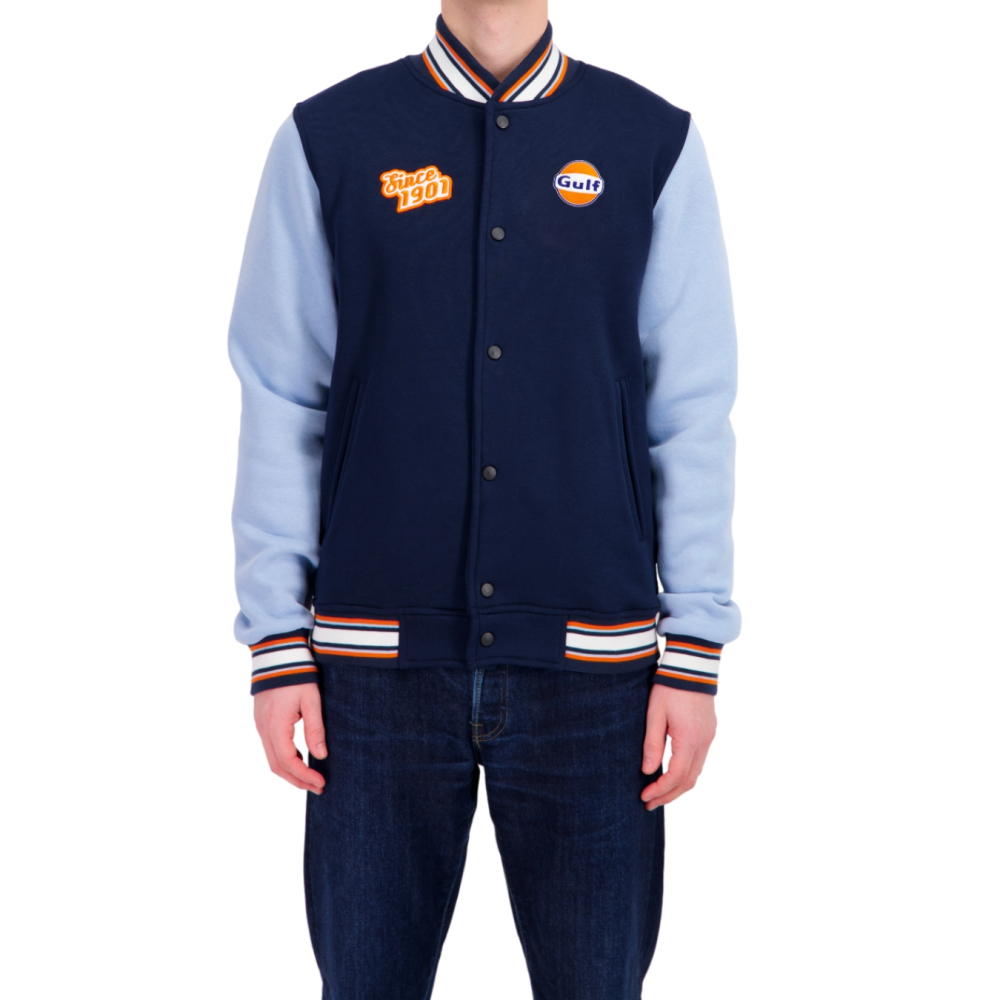 Affichez fièrement l'héritage Gulf avec ce blouson varsity à l’esthétique rétro incontournable. Conçu dans un mélange de bleu marine et bleu ciel,